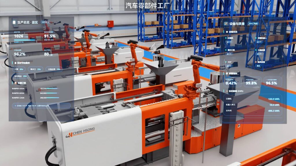 Built on the DataMesh FactVerse platform, Chen Hsong’s solution converts production line proposals into interactive digital twin environments. Engineers and customers can simulate different configurations and visualize key operational metrics—including throughput, cycle time, and energy consumption—before physical deployment.