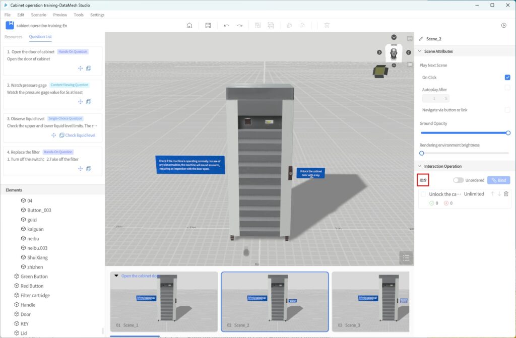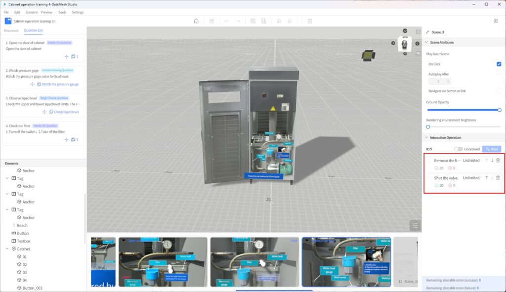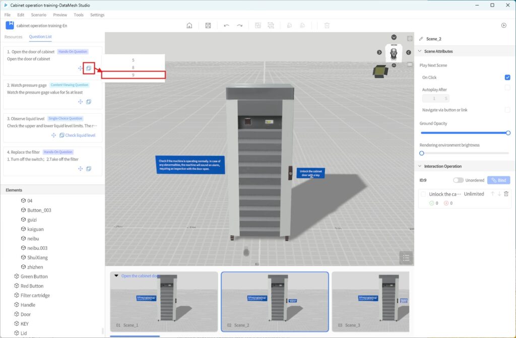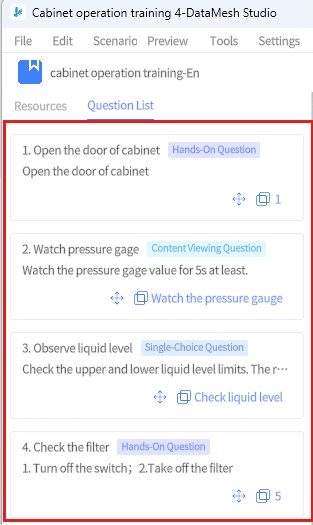 Once completed, the scene’s properties panel will show the list of interaction operations. For detailed instructions, refer to the “Edit hands-on questions” section.