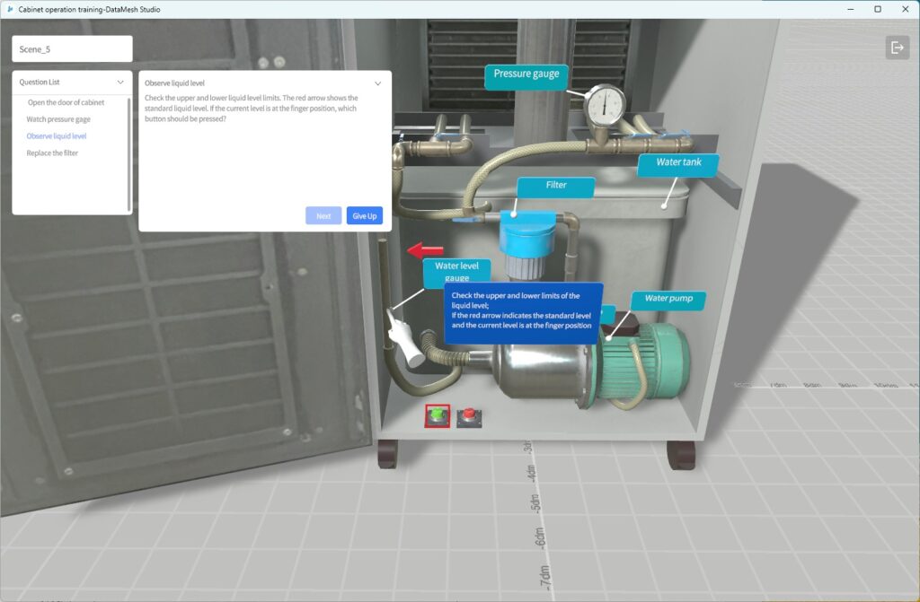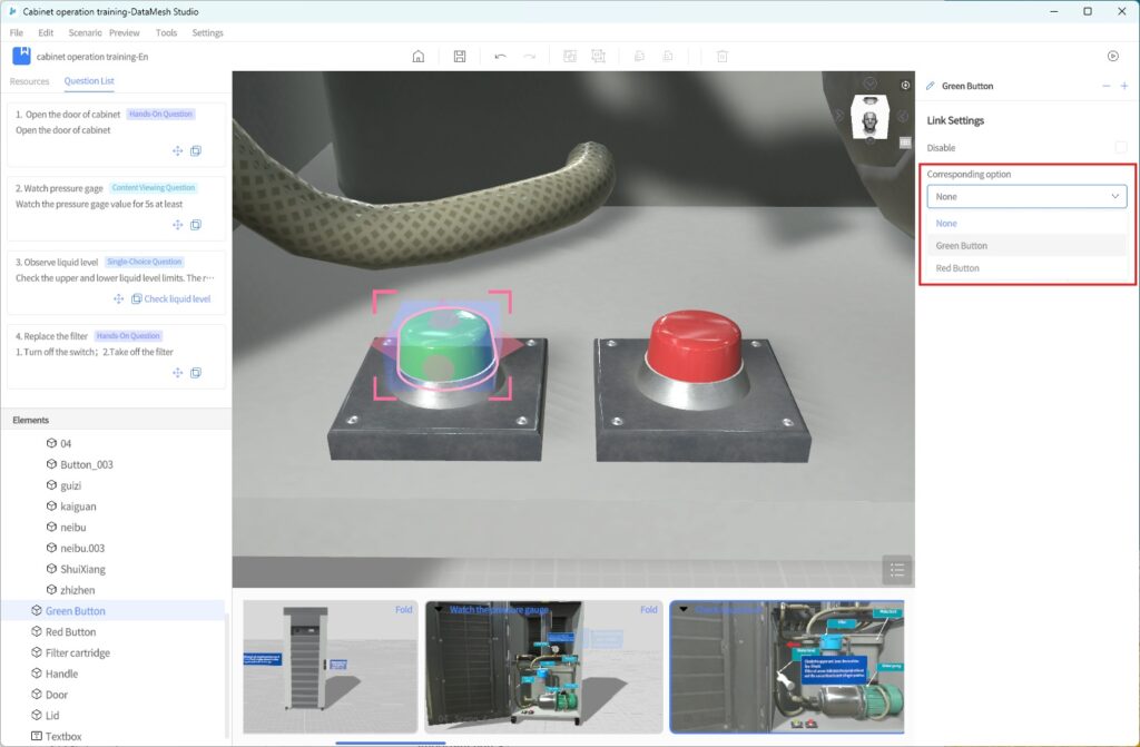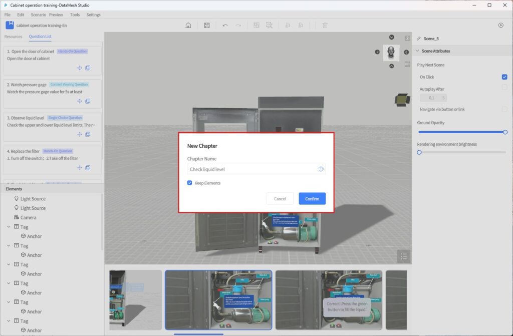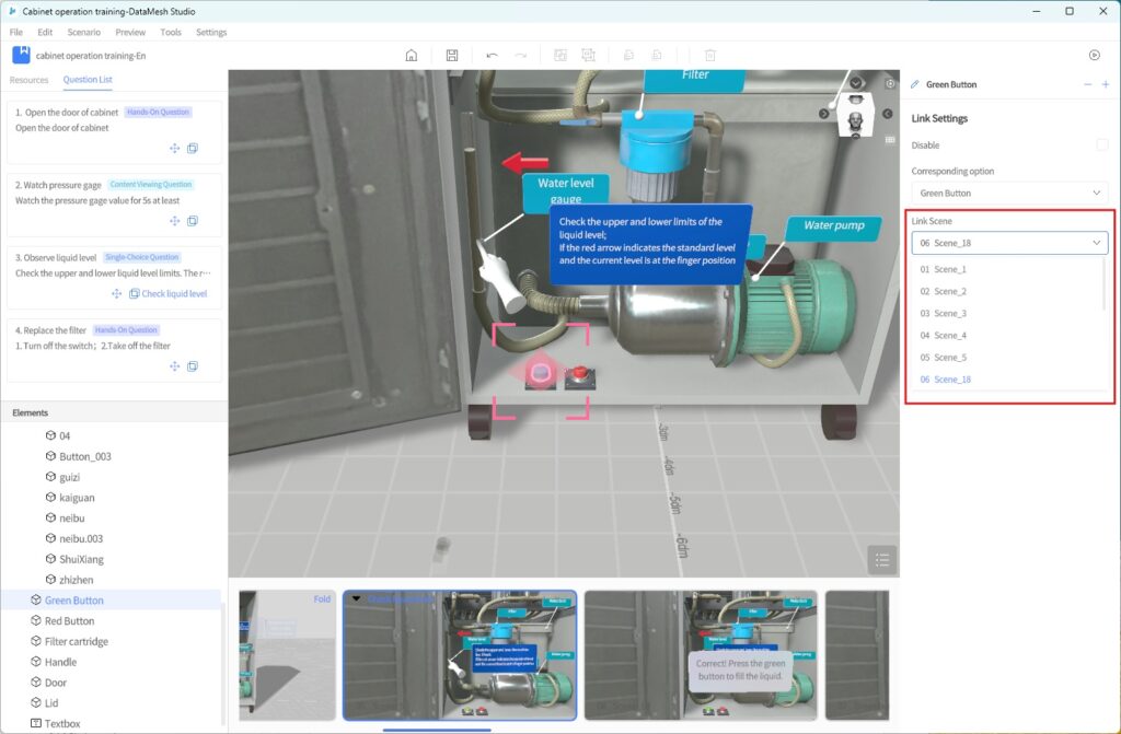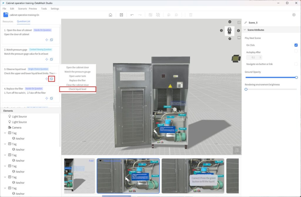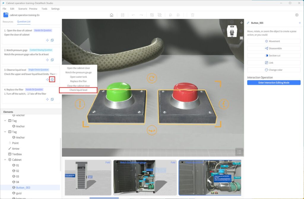 2. Create a question chapter: Create a chapter that includes interactive content (e.g., “Check Liquid Level”) and add interactive objects (e.g., red and green buttons) to the scene.