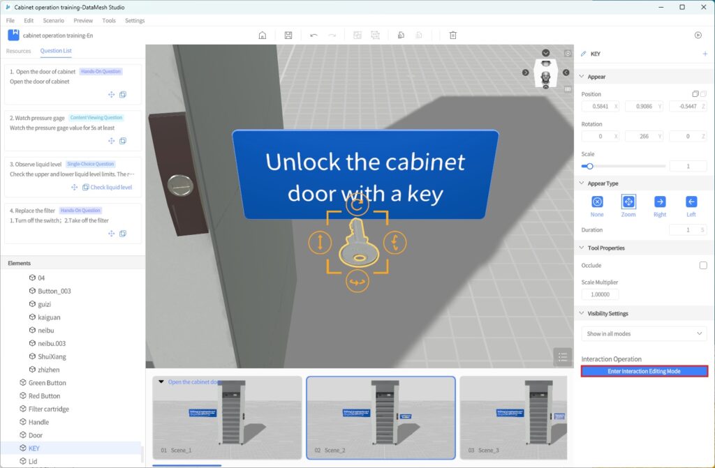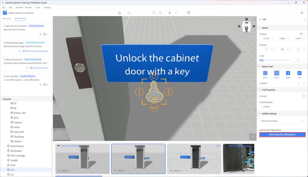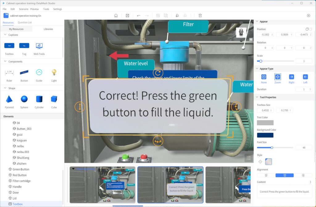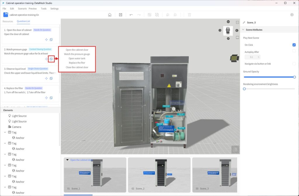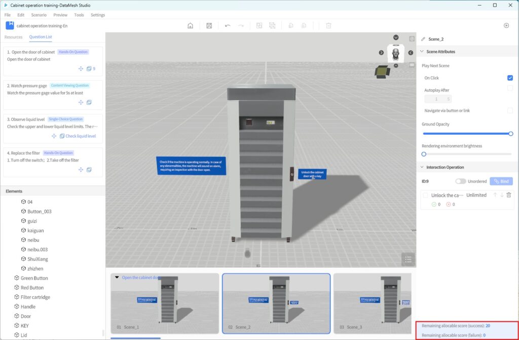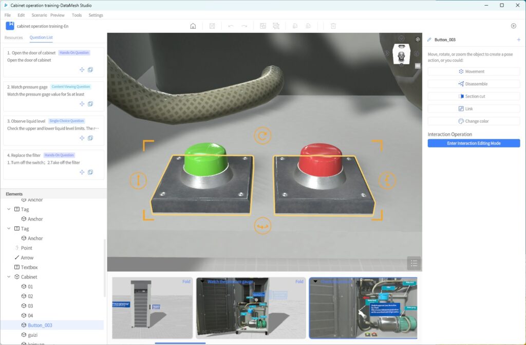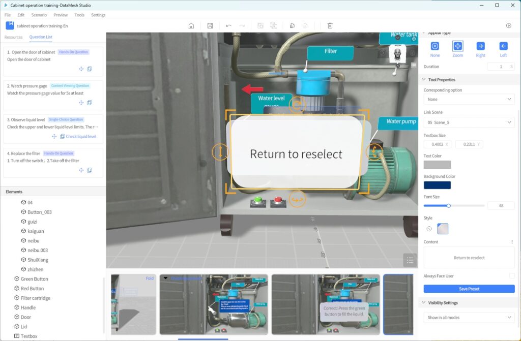 2. Create a question chapter: Create a chapter that includes interactive content (e.g., “Check Liquid Level”) and add interactive objects (e.g., red and green buttons) to the scene.
