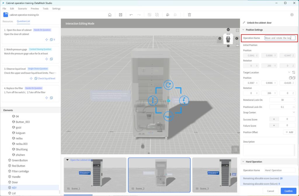 | Hands-On Question | Bind to an interaction ID and configure target positions, rotation angles, scoring rules, and operation sequences. |