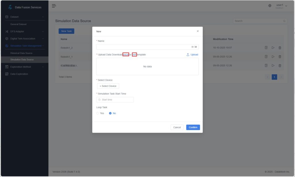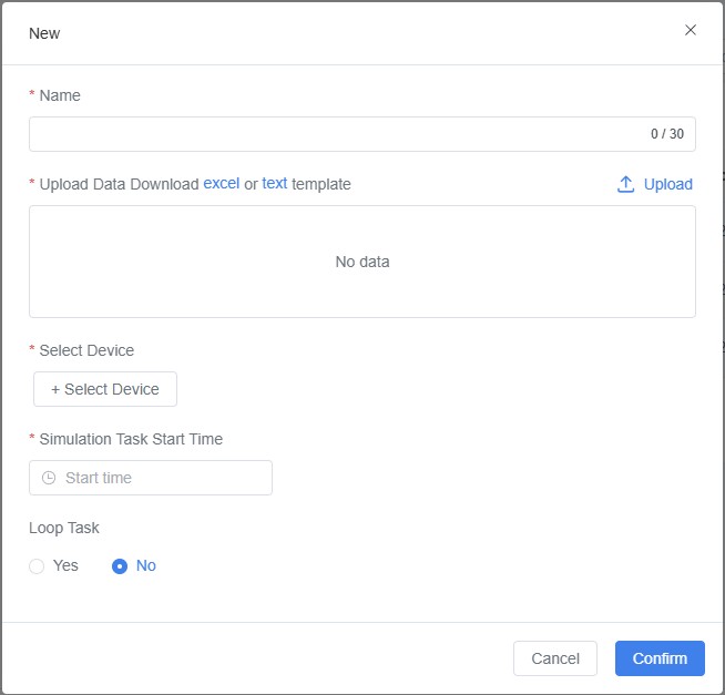 - In Simulation Task Management > Simulation Data Source, click [New Task] > Excel or Text Template to download predefined templates.