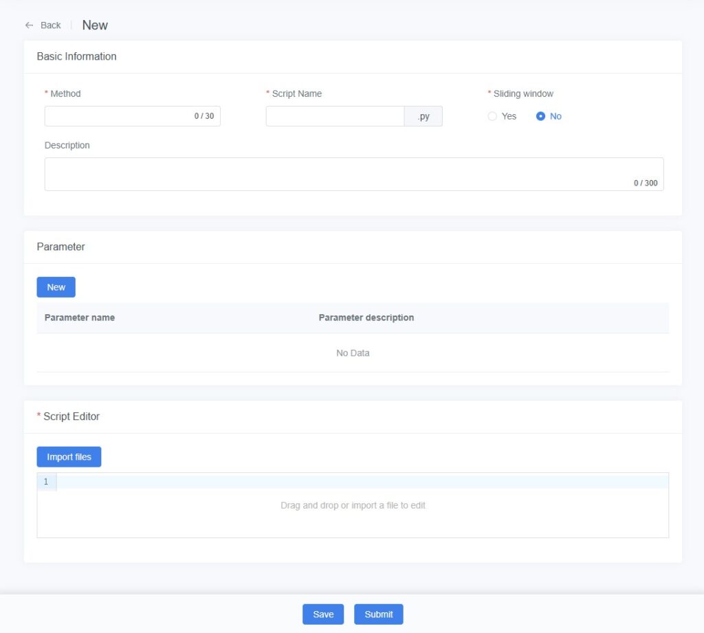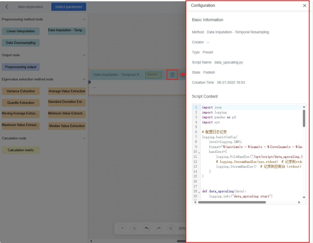 Example: Add a “Window Size” parameter, allowing users to specify its value when executing exploration tasks for flexible control of eigenvalue extraction. - Upload or Edit Script: Upload a Python script file by drag-and-drop, or enter Python code directly into the editor.