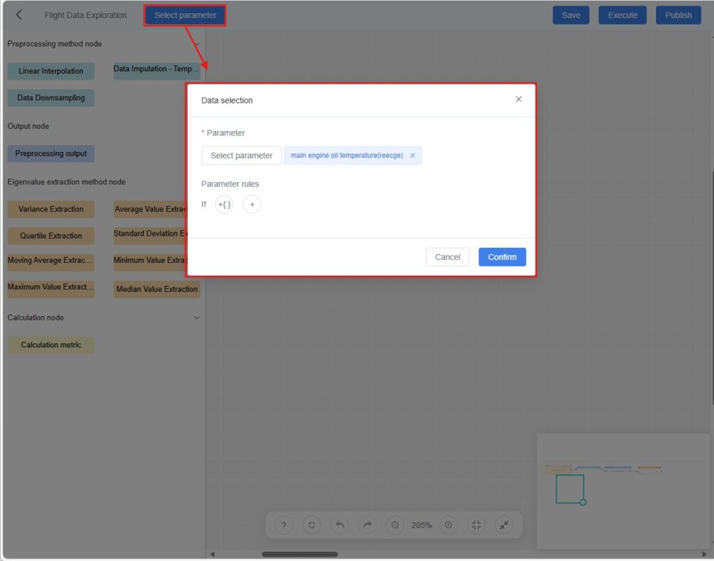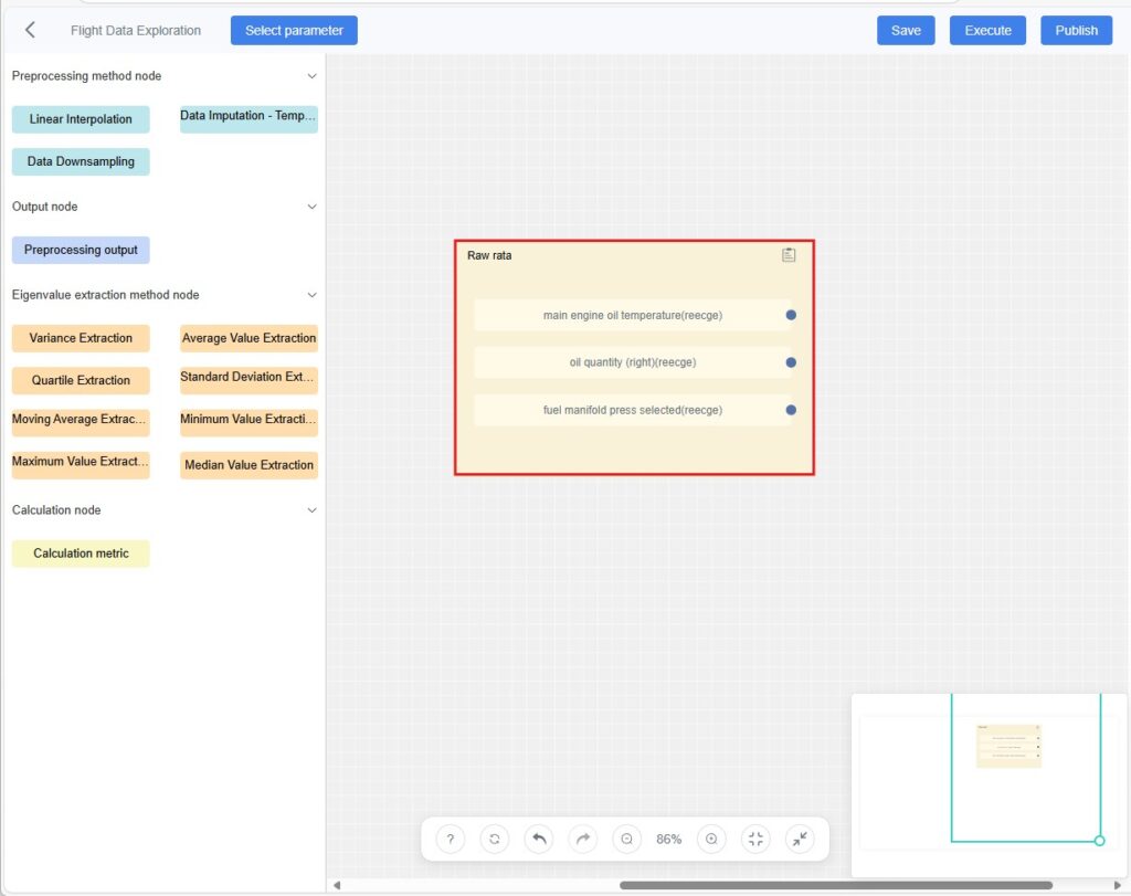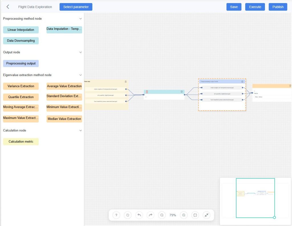 Click [Execute] (top-right of the canvas). The system executes the node logic defined in the workflow (e.g., cleaning, eigenvalue extraction, model computation) and generates analysis results.