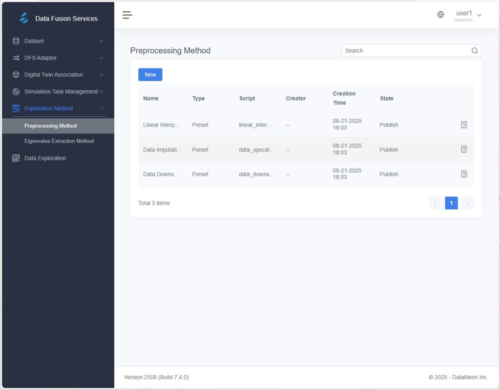 - Add Preprocessing Method: Allows users to upload or directly input Python scripts to create custom preprocessing methods.