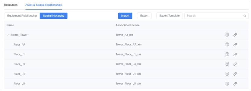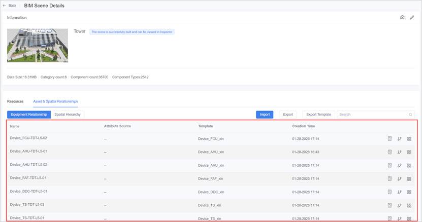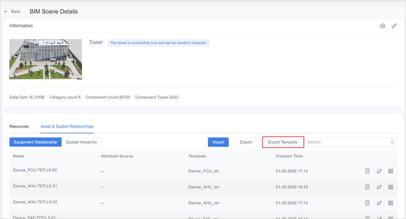 The Excel template is used to create or maintain equipment and spatial digital twins in bulk, as well as to configure equipment relationships, spatial relationships, and scene associations.