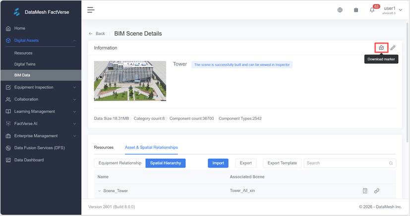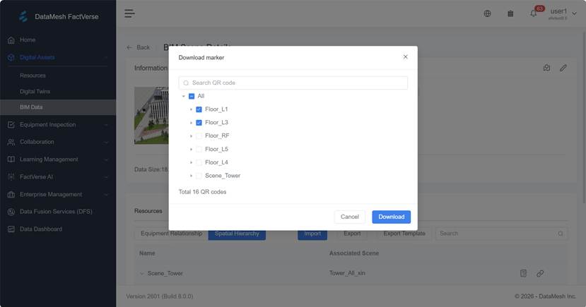 The downloaded marker is a QR code image file that can be printed and affixed at the corresponding on-site location (such as a building entrance or a floor corridor). After scanning this QR code with DataMesh Inspector (mobile), the system will automatically locate and load the corresponding digital twin scene.